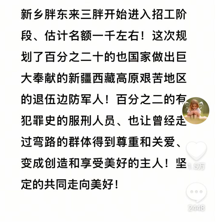 新乡胖东来招1000人,200个名额给边防退伍军人,20个名额给有前科人员